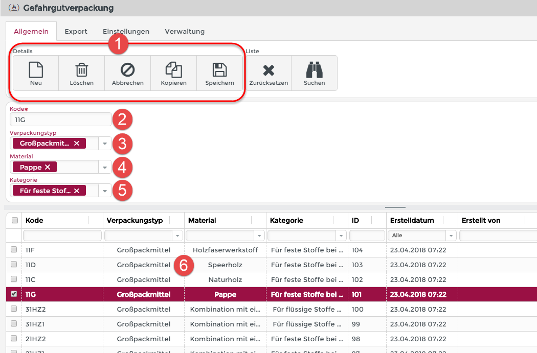(1) Neu, Löschen, Abbrechen, Kopieren, Speichern Gefahrgutverpackungen können in der Datenbank gespeichert, oder kopiert und gelöscht werden.