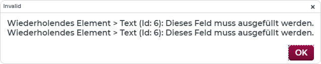 Der "Wiederholendes Element" Container beinhaltet ein Textfeld mit Element-ID 6, welches ein Pflichtfeld ist (somit ist es ungültig, solange es leer ist).
