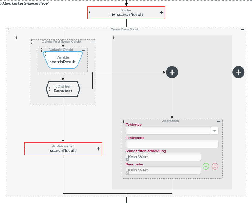 Im Kontext eines Formulars (s. Portale bzw. Erfassungsmasken) soll ein Client Workflow-Verhalten abgebrochen werden, wenn die initial ausgeführte Suche (Ereignisaktion) kein Ergebnis liefert, die auf ein Benutzerkonto (s. Benutzer) zugreifen soll.