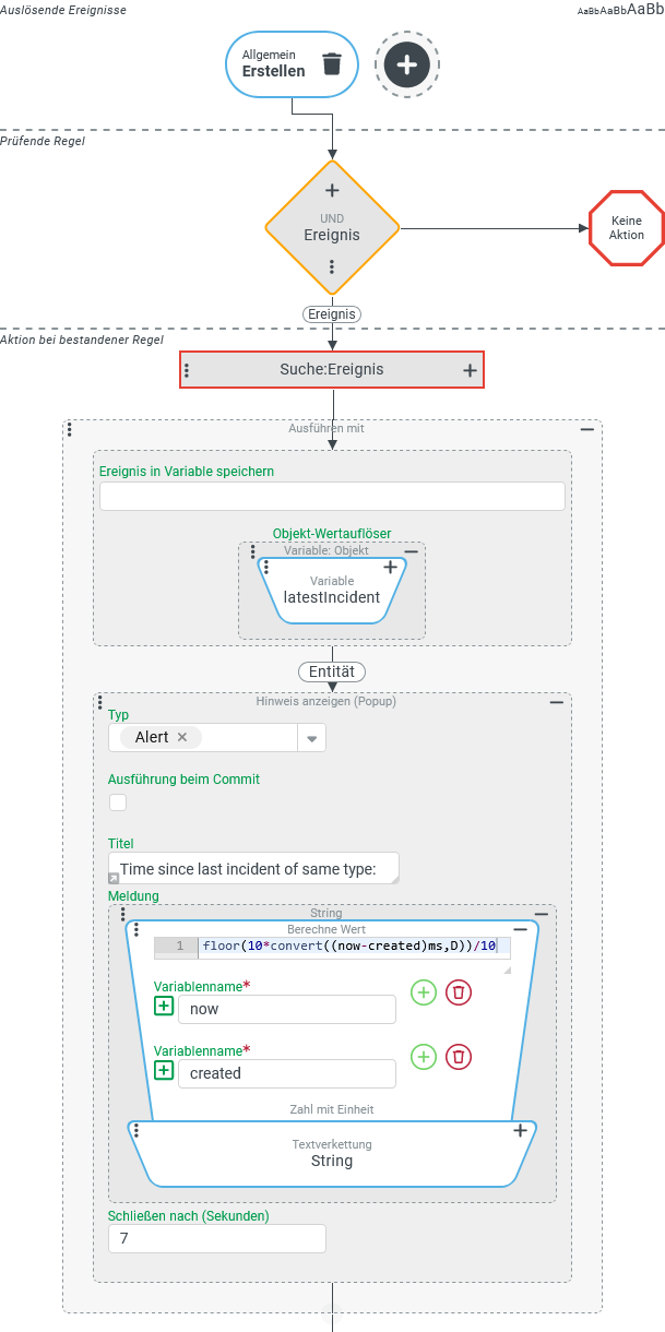 Die rechts abgebildete Ereignisbehandlung reagiert auf das Auslösende Ereignis (s. Allgemein (Ereignisse)) "Erstellen", das u. a. beim Speichern einer Entitäten durch den Benutzer in einer Erfassungsmaske ausgelöst wird . In der Prüfenden Regel wird Typprüfung sichergestellt, dass eine Enität des Typs "Ereignis" erstellt werden soll. Als Aktion bei bestandener Regel wird zunächst die Suche (Ereignisaktion) ausgeführt, die unter allen bisher erstellten Ereignissen nach "vergleichbaren" Vorfällen sucht. Details zu den Kriterien für die Suche sind für den weiteren Workflow unerheblich.