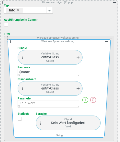 Im Aktionsteil einer Ereignisbehandlung soll der Benutzer durch eine Hinweis anzeigen (Popup)-Ereignisaktion über das auslösende Ereignis informiert werden. Wie rechts ersichtlich, wird die Hinweis anzeigen (Popup)-Ereignisaktion innerhalb einer Ausführen mit-Ereignisaktion platziert, die im Objekt Resolver den Auslösendes Ereignis-Wertauflöser verwendet. Dies ist einerseits nützlich, weil der "Titel" und die "Meldung" abhängig vom auslösenden Ereignis definiert werden sollen. Andererseits - und das ist hier besonders wichtig - wird die Variable entityClass für den Aktionsblock der Ausführen mit-Ereignisaktion automatisch mit dem Namen des konkreten Typs des auslösenden Ereignisses belegt, der zum Abrufen der Lokalisierungen in der Hinweis anzeigen (Popup)-Ereignisaktion (s. unten) benötigt wird. |