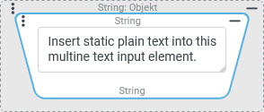 Wenn Wertauflöser über Parameter eines bestimmten Typ verfügen, muss diesen Parametern im Kontext der Konfiguration ein Wert zugewiesen werden können. Der rechts abgebildete Wertauflöser für statischen Text (s. Text) bietet dafür ein Eingabefeld für Text an, dessen Wert ausschließlich im Konfigurationskontext geändert werden kann. Zur Laufzeit wird der konfigurierte Textwert "statisch" (unveränderlich) zurückgegeben. |