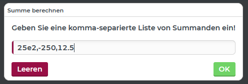 Im Kontext einer Ereignisbehandlung soll der Benutzer die Möglichkeit erhalten, per Benutzereingabe eine komma-separierte Liste von Summanden einzugeben, deren Summe anschließend berechnet wird.