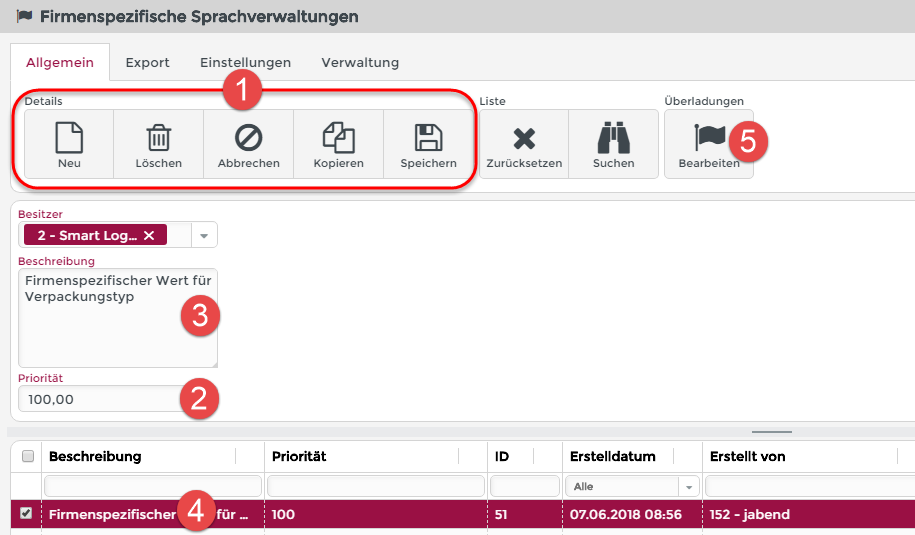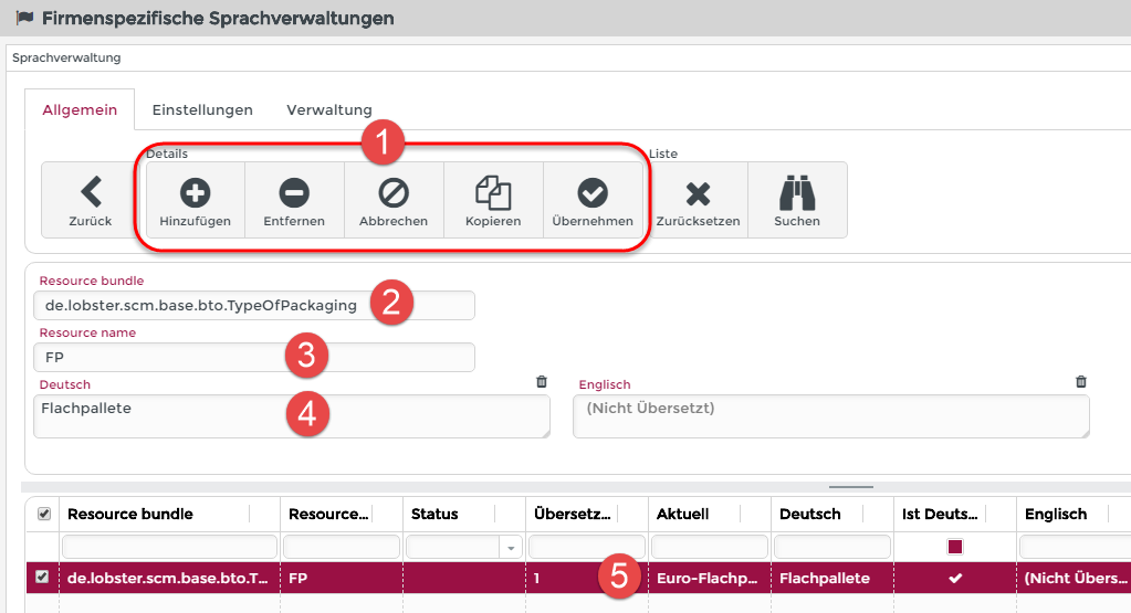 (1) Neu, Löschen, Abrechen, Kopieren, Speichern Firmenspezifische Sprachanpassungen können in der Datenbank gespeichert werden.