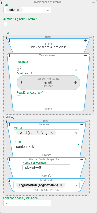 • Der verkettete Objekt-Feld-Wertauflöser liest das Feld registration aus der "Aircraft"-Instanz, über dessen Wert die Auswahl in der Meldung identifiziert werden soll.
