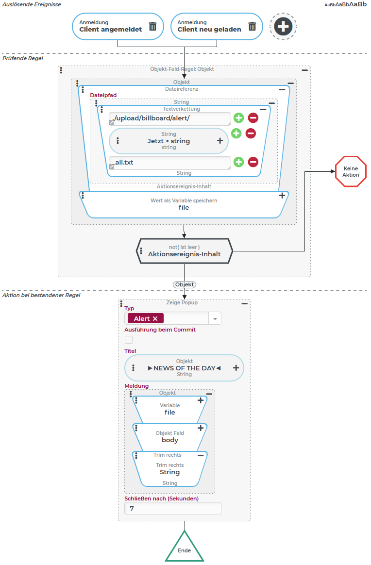 • Die einzige Aktion bei bestandener Regel ist das Anzeigen der Nachricht durch eine Hinweis anzeigen (Popup)-Ereignisaktion, die den Dateiinhalt (body) aus der Variablen file liest und über den verketteten Trim rechts "aufbereitet", um Whitespace am Dateiende ggf. für die Anzeige zu unterdrücken.