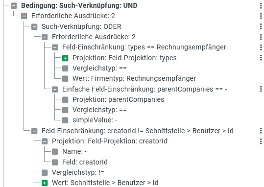 Im Abfragekonfigurator steht zum Konfigurieren der "Bedingung" außerdem eine Baumansicht zu Verfügung, in der die hier beschriebenen Operationen teilweise auch ausgeführt werden können.