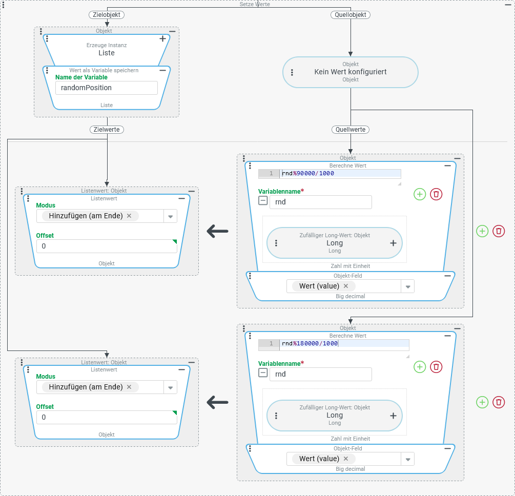 Für automatisierte Tests einer Schnittstelle sollen im Kontext einer Für jeden Eintrag wiederholen (Schleife) wiederholt zufällig bestimmte Geopositionen erzeugt und einer Variablen randomPosition zugewiesen werden.