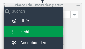 Die Einfache Feld-Einschränkung mit der Bedingung active == true wird dadurch insgesamt negiert, also "verneint". Durch die Auswahl der Verneinung wird die Einfache Feld-Einschränkung automatisch in eine übergeordnete Such-Verknüpfung eingefügt, die als Träger der Verneindung benötigt wird. Auch mit dieser Variante könnte die Suche "Treffer" mit den Werten false und $null liefern, wenn die Projektion $null als Wert zuließe. |
