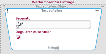 Der Text aufteilen-Wertauflöser teilt den als Eingabewert anliegenden Text an jeder Fundstelle für den optional parametrierbaren Separator (Zeichenfolge oder ein Regulärer Ausdruck) und gibt die so gebildeten Teilzeichenfolgen als Liste (String[]) zurück.