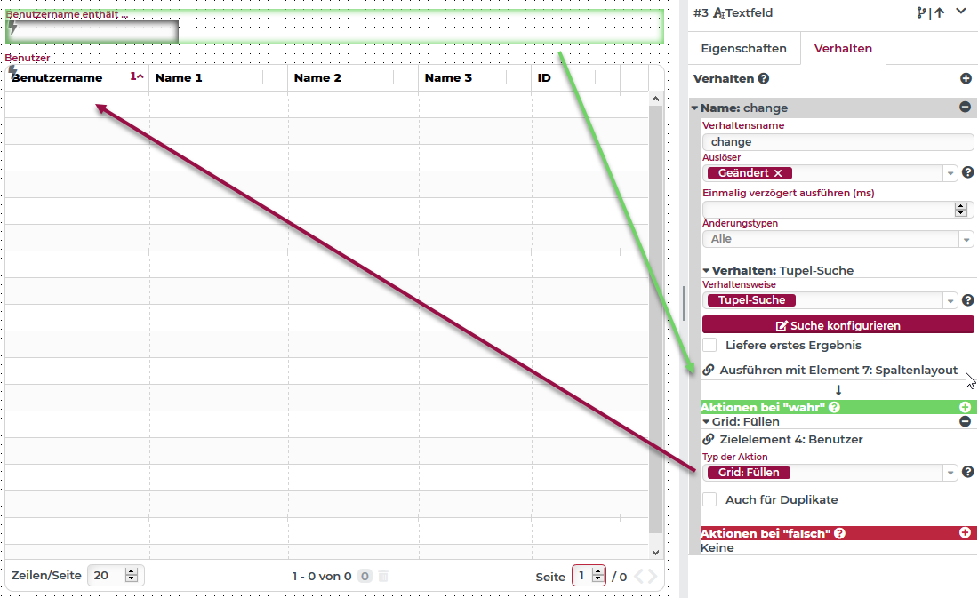 Die Verhaltensweise Tupel Suche (Formulardesigner) verwendet eine Verknüpfung auf das im Bild grün markierte Spaltenlayout. Die im Textfeld "Benutzername enthält ..." übergebene Zeichenfolge steht damit innerhalb der Such-Konfiguration als Wert einer Variablen mit dem Namen criterion (Datenfeldname des Textfelds) zur Verfügung. Die Tupel Suche (Formulardesigner) soll nur Daten von Benutzern zurückgeben, deren Benutzername (username) diesen Wert enthält. Das wird z. B. durch die folgende Feld Einschränkung in der Bedingung der Tupel Suche (Formulardesigner) erreicht: