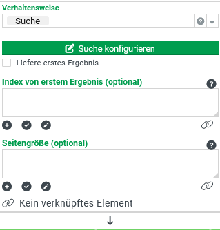 Die Verhaltensweise Suche (Formulardesigner) führt eine Suche in der Lobster Data Platform / Orchestration-Datenbank (siehe auch Such API) aus und übergibt die Suchergebnisse als Datenservice an die Aktionen bei "wahr".