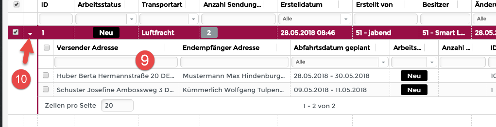 (8) Sendungsliste Klickt man auf (8), dann werden die Sendungen des Manifests angezeigt (9)