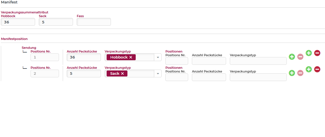 Innerhalb der Manifestposition sind für je eine Sendung mehrere Positionen ggf. mit Unterpositionen zu sehen, für die jeweils eine Anzahl Packstücke in Verbindung mit einem Verpackungstyp angegeben werden kann.
