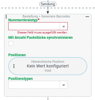 Zweck: Befüllt Barcode-Attribute von Positionen einer Sendung mit Werten aus einem Nummernkreis. Optional wird dabei die Anzahl der Barcode-Attribute innerhalb einer Position mit der "Anzahl Packstücke" derselben Position synchronisiert, indem ggf. Barcode-Attribut hinzugefügt oder entfernt werden.