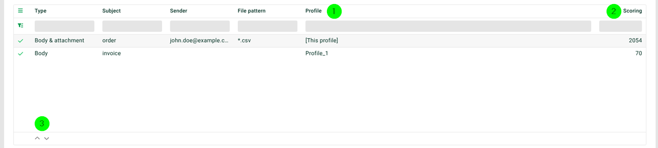 A new rule can be created via the context menu. The distribution rules are processed from top to bottom. If the first rule takes effect, the email data is forwarded to the (processing) profile of this rule (1) (column "Profile"). You can either have the rules sorted by the scoring (2) (column "Scoring") or you can sort them manually (3) (arrows at bottom). The scoring is calculated internally according to the rules of the profile scoring.
