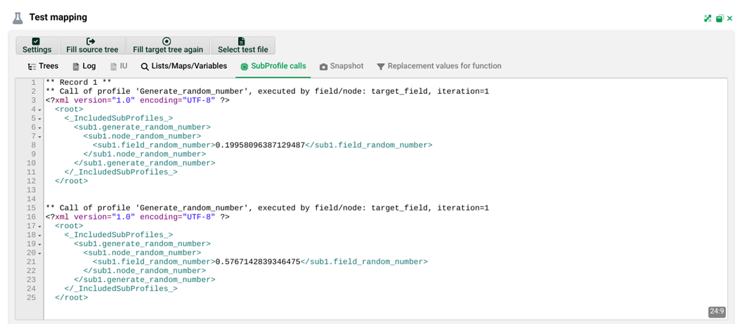 When you perform a mapping test, you see one record. In the subprofile calls tab, you can also see only one subprofile call.