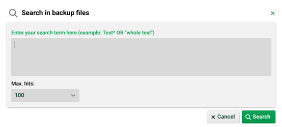 The search in indexed backup files can be reached via the context menu of a profile ("Search in backup file") in the Control Center under "Logs/Jobs per profile". As a result of the search, only the jobs that meet the search conditions are then displayed in the same place.