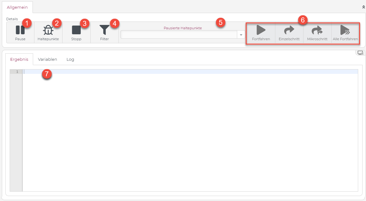 Starting from the last state from example 1, the individual loop passes can now be analyzed with the 'Resume' function in the debugger (6).