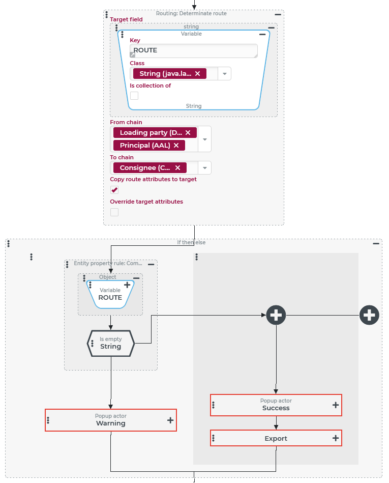 • The 'Else' branch defines the processes after a successful 'routing'. In addition to the success message (via Show alert (Popup)), the shipment is flagged here via Export event action for transfer to a Lobster_data profile when the transaction is completed. For example, the forwarding of data to an executing system can be made dependent on the addressing of the shipment being evaluated as "legitimate" or sufficiently qualified in comparison with the applicable Routing table. As long as information is missing or an invalid 'From'/'To' combination is present, a warning appears instead.