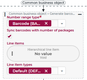 The Generiere Barcodes (Allgemeines Geschäftsobjekt) event action generates barcodes via a specific Number range type (see Number range) in order to assign these 'empty' instances of barcode attributes to relevant line items of a reference object of the Allgemeines Geschäftsobjekt type as 'barcode' (barcode).