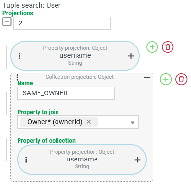 ►NOTE◄ This example also shows that the order of the list entries within the SAME_OWNER property is 'unsorted'. It is not possible to influence the order within the collection. Sorting according to a Property projection such as u2.username is also not helpful. On the contrary: The Collection projection still returns unsorted and the sorting multiplies the output lines (user x u2) although the option Optional is selected in the Entity join (u2) (see above). |