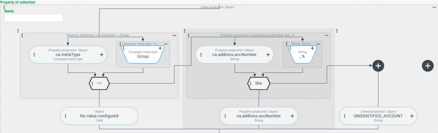 The following screenshot shows an additional branch in the Case projection for the Property of collection, in which the 'meta type' of the company (ca.metaType) is evaluated before all other conditions in order to assign 'No value' ($null) if the Company meta type 'Group' (GROUP) is present.