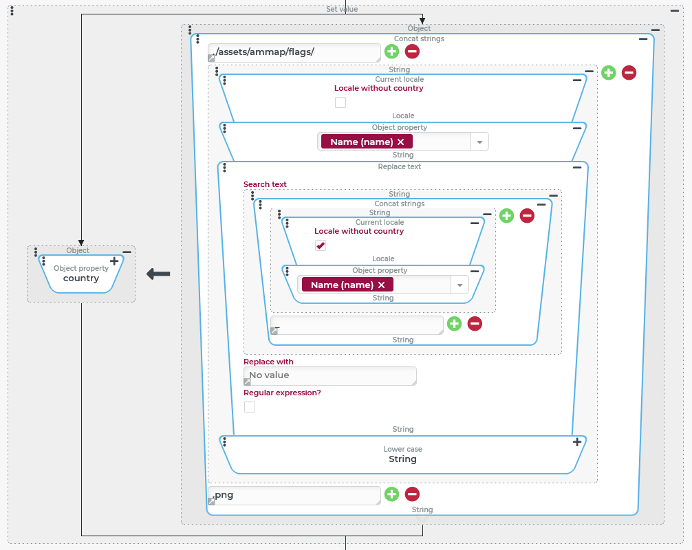 ►NOTE◄ The left flag of the two 'flags' is defined by another section in the Client workflow described only partially below, based on Current locale ('without country'). However, it must be taken into account that the internal name of the Locale 'English' (en) does not correspond to an ISO 3611 alpha2 abbreviation. The output in the runtime example can be obtained by placing a copy of the flag graphic gb.png under the name en.png. Then this assignment (en=gb) can also be used in other contexts. Otherwise, this can be done by replacing the 'language name' en with the country code gb (or any other such as us or au) using Replace text when building the file name.