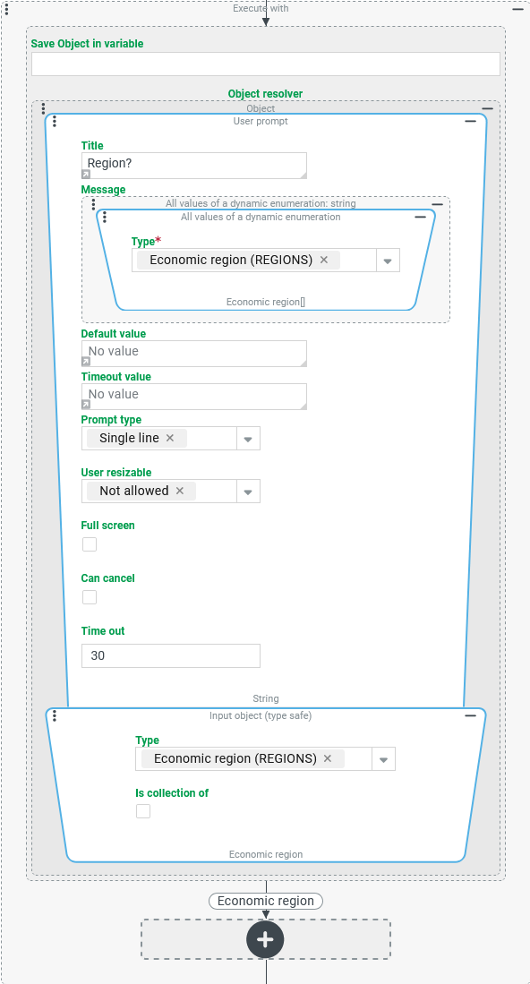 The screenshot on the right shows how the User prompt resolver can be used within an Execute with event action to provide the 'Economic region' identified by text input as a reference object for the action block below (still empty in the image on the right)