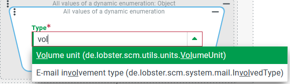The Type required field parameter requires the static single selection of a dynamic enumeration via a Combobox element. This has a search function that takes into account both the localizations and the internal (class) names for predefined and custom Enumerations. |