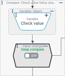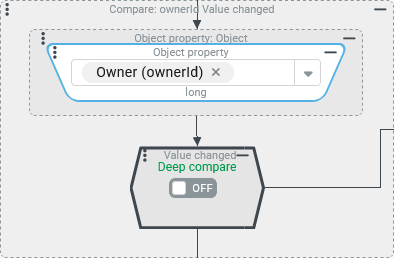 If the Value changed compare type is selected for an Entity property rule, only one value configuration is displayed, referred to here as the check value configuration. The Deep compare option in the compare type configuration is switched off (OFF) by default. |