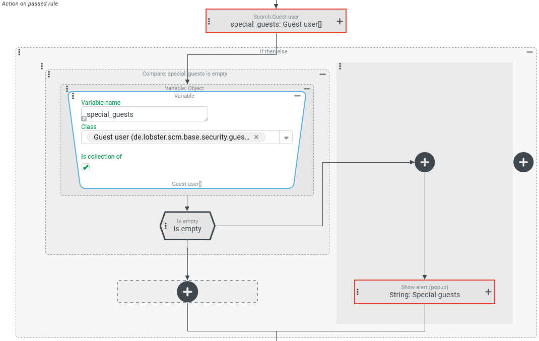 • The special_guest variable serves as a Check value, which is filled by the Search (Event action) with a Collection of entities with the Class 'Guest user' (GuestUser), provided that the search criteria configured there return matches. If this is not the case, the Search (Event action) returns an empty list ([]).