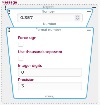 The Format number value resolver generates a string with the formatting defined by the parameters, starting from a numeric input value.