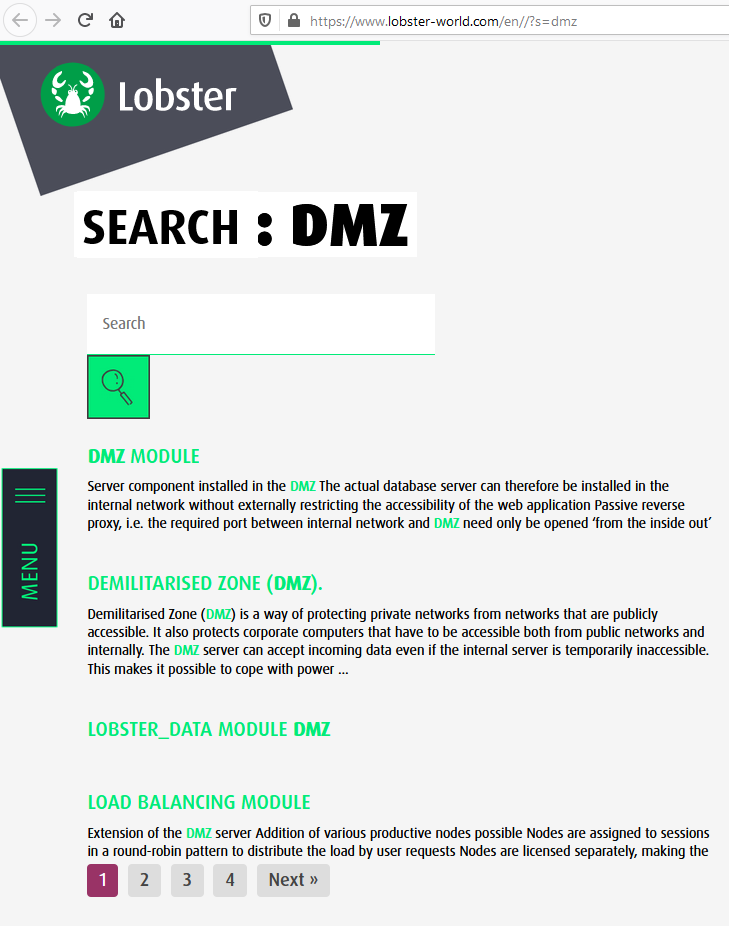 Within a login that uses the login language 'German', entering the search term 'dmz' results in the URL shown in the upper right corner. ►NOTE◄ The actual search results obtained with this search term may, of course, differ from the status recorded here, as may the design and functionality of the website. |