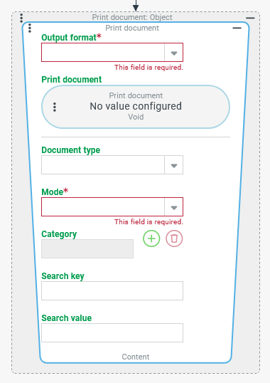If there is a value configuration for the Print document parameter, a 'Print document' entity is expected for its return value at runtime. The selection process via Association criteria and further parameters is then omitted.