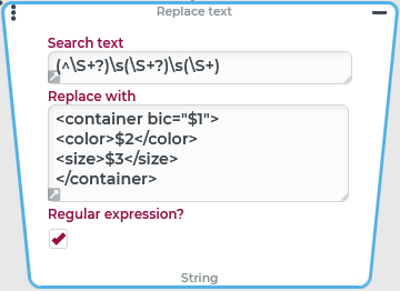 The previous example is now adapted under the assumption that the string with the 'Container details' in the input value always contains the same tokens (@BIC@ @COLOR@ @SIZE@) in exactly this order.
