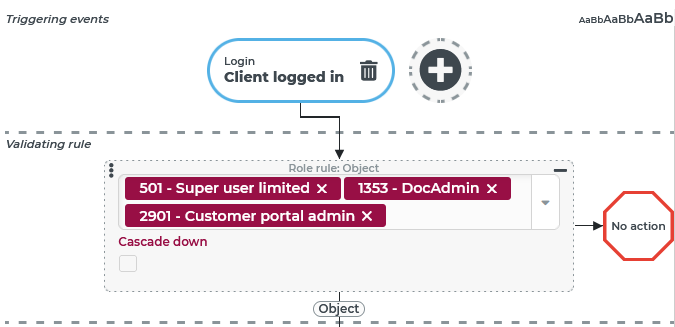 An event handler that reacts to the 'Client logged in' event (see Anmeldung (Ereignis) checks in the Validating rule whether the login concerns one of the 'specially privileged roles'. As can be seen in the screenshot, the relevant Roles can literally be 'handpicked' in a Role rule by multiple selection. ►NOTE◄ The multiple selection label shows the internal role names (roleName) regardless of whether there is a localization or not. |