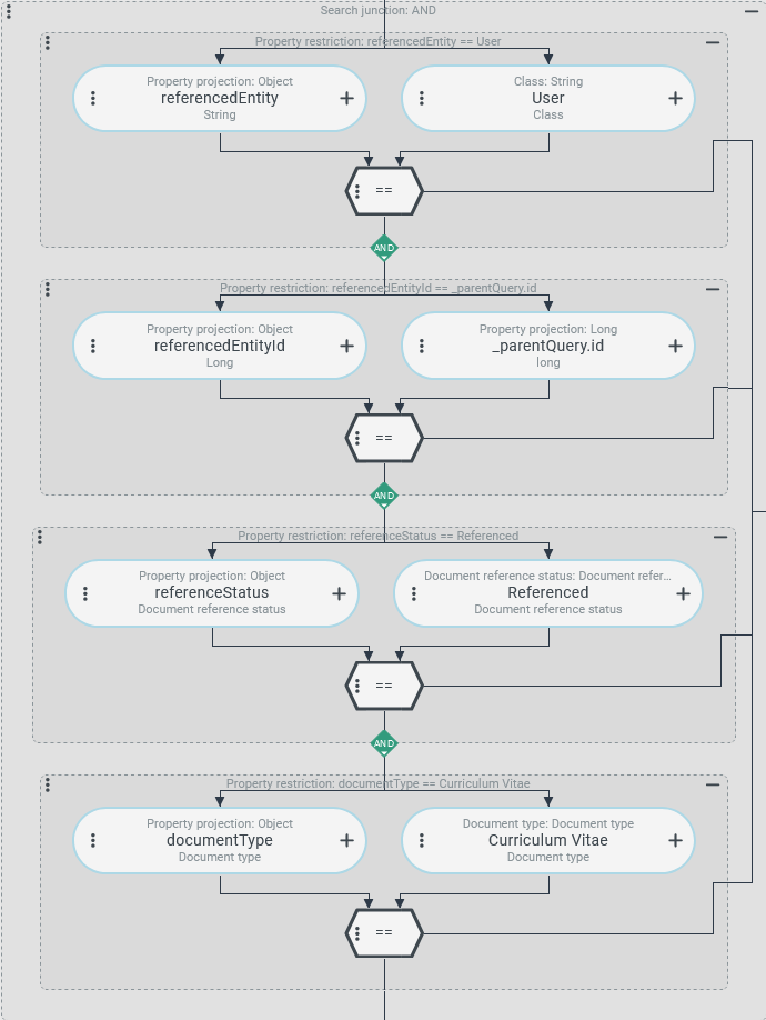 • As a Where condition, several instances of the Field restriction must be checked within an AND conjunction in order to determine whether the document to be evaluated is assigned to the user account from the parent search (here: the implicitly generated Tuple search for the custom overview). Details on the Search junction can be seen below.