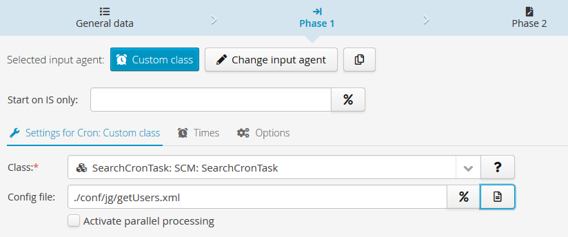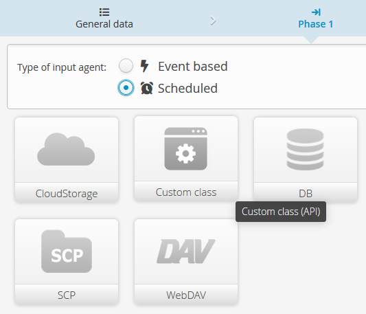 In the Phase 1 tab, the Type of input agent must first be selected. After selecting Scheduled, the option Custom class (API), to which the SearchCronTask API belongs, appears below.