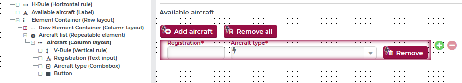 A Repeatable element 'Aircraft list' is used to manage a list of 'Aircraft' as elements with properties Registration and Aircraft type.