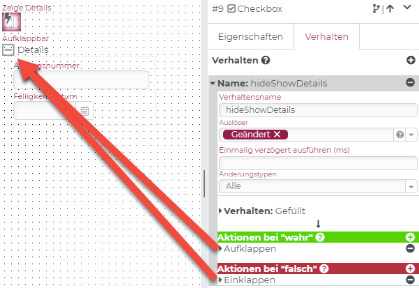 In the image, the checkbox is configured with a behaviour that expands or collapses the Expandable container when its value is changed.