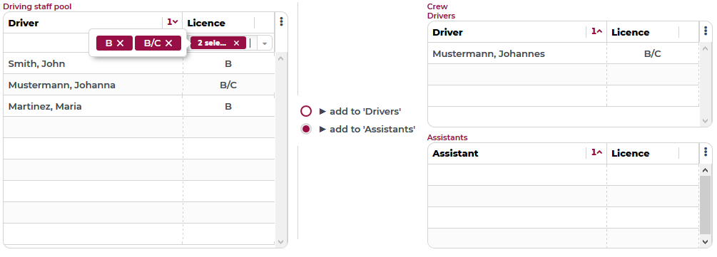 For a truck transport, a suitable Crew should be assembled based on available candidates in a certain Driving staff pool. Within the crew, the role of Drivers and Assistants must be filled. Multiple allocations should be possible.