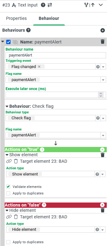 If the flag in question was set before the action was executed, the triggering event Flag changed is triggered, so that other behaviours can be executed within the form.