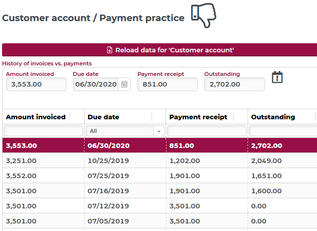 The source data from a Tuple search (Form designer) behaviour is transferred by Populate element data into a Repeatable element, whereby criteria for a customer's poor payment behaviour are checked. If these apply to any of the invoices, a flag with the name 'paymentAlert' is set via Set flag, and a warning symbol is displayed in the form header (see below).
