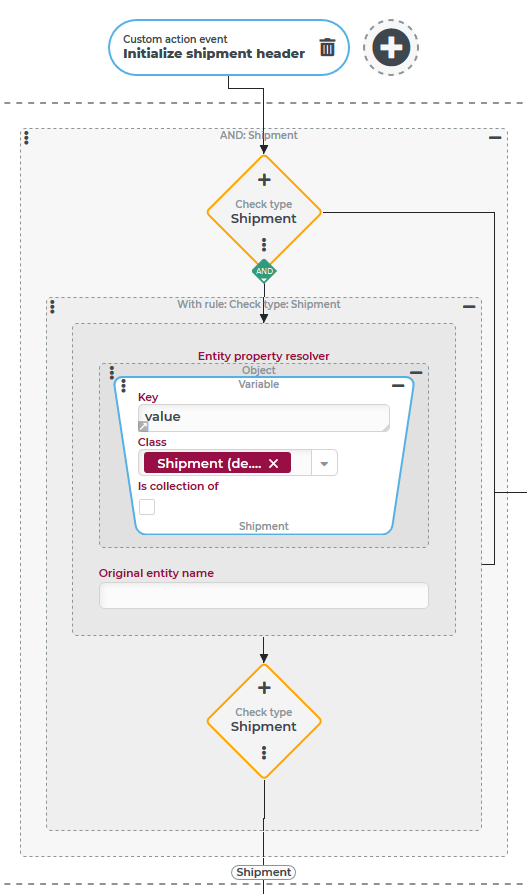 Within event handling, which is not described in detail here, the Variable value can be accessed during lookup to determine the corresponding purchase order by a Search (Event action). The Direct line items can then be evaluated with a Rule list resolver to search for a match for the value in the Text field 'Goods description'. Once a suitable order line item has been determined, the desired properties or attribute values are transferred to the shipment line item entity via Set value, which is the input value for the event.