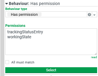 The check in the example on the left specifies two permission nodes in relative paths in the Permissions parameter. With this configuration, the behaviour could be used in the context of Input forms for different business object types, in order to globally check if the Role of session grants any access to entries for Working state or Tracking state for the respective business object type. However, the selection dialog displayed by clicking Select would not indicate any selection for this configuration. |